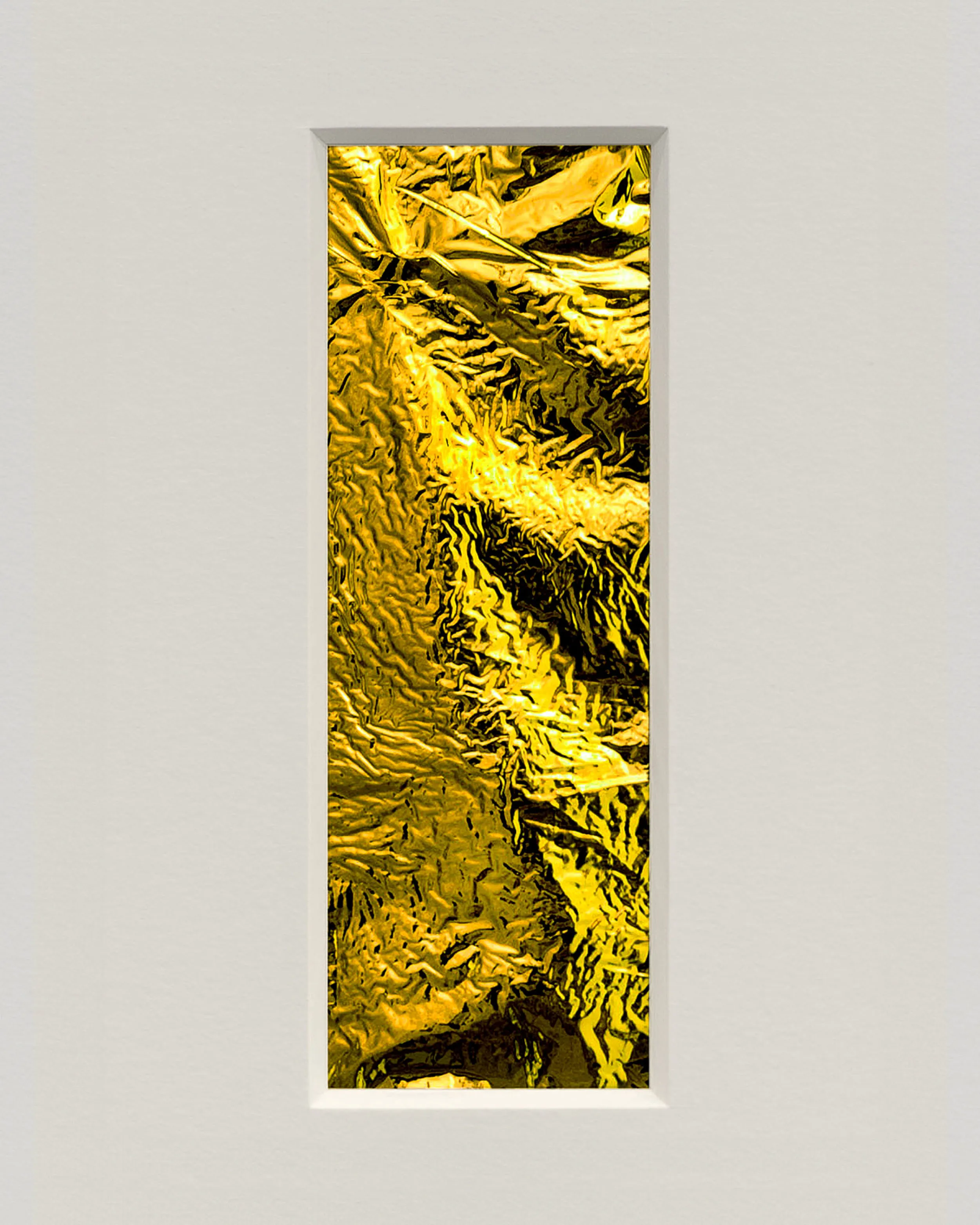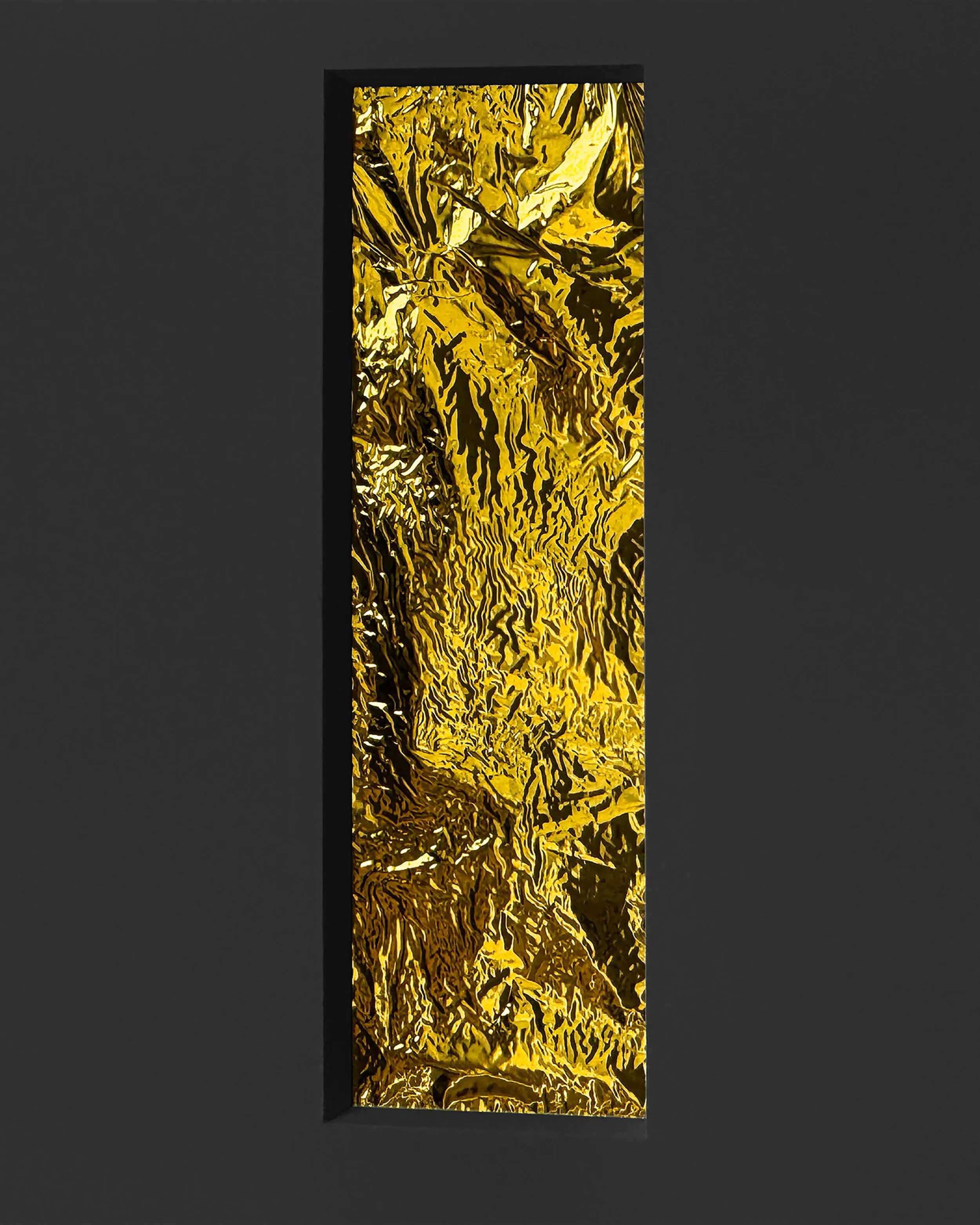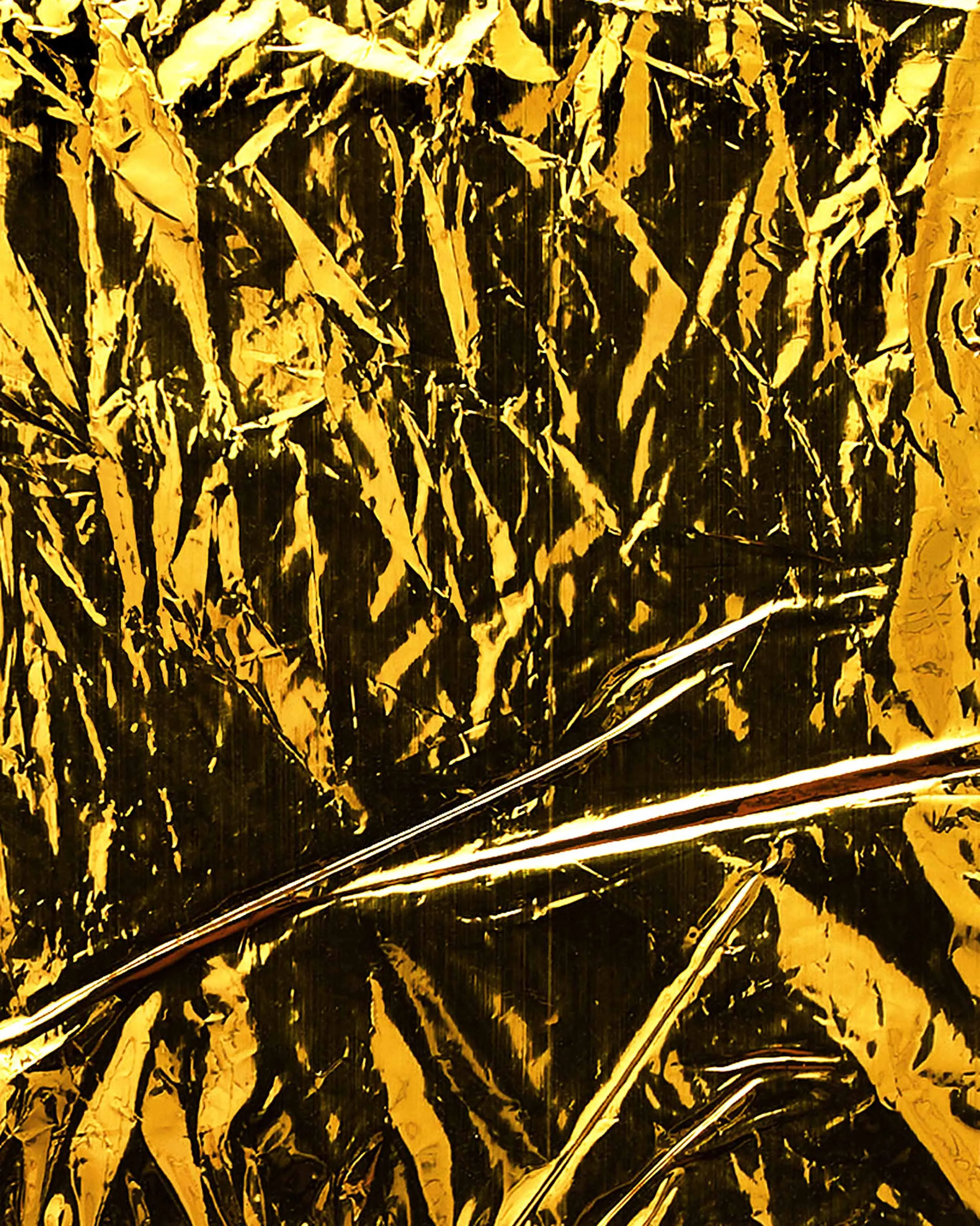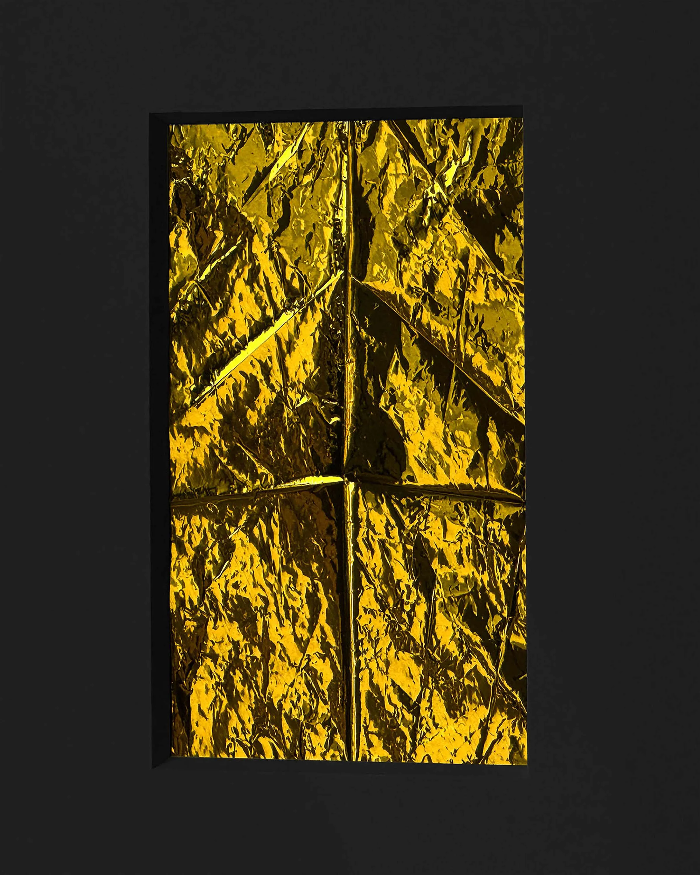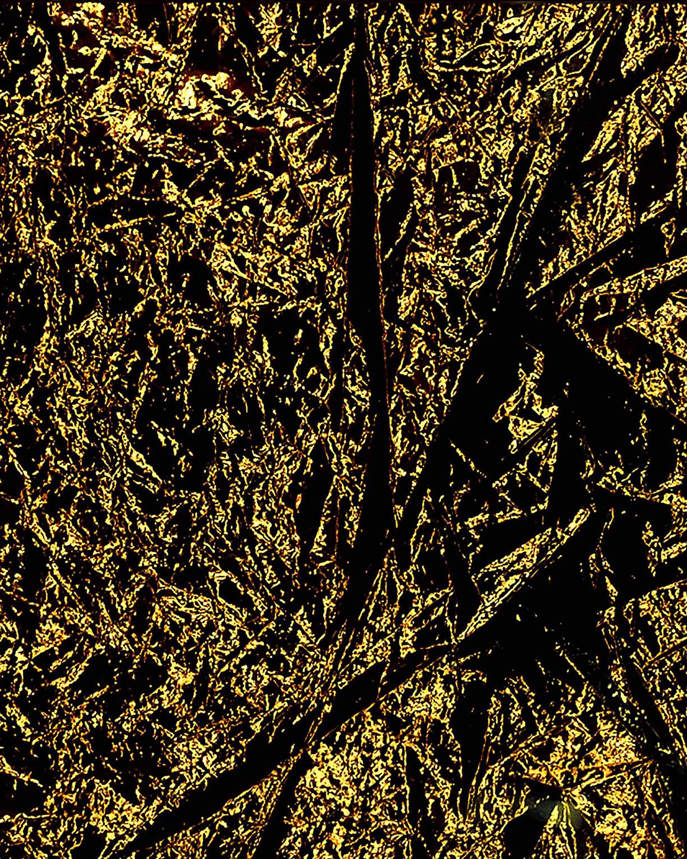 If Rembrandt domesticates Segers’ angel into a traditional landscape, the pieces in this exhibition may be said to make the opposite gesture: magnifying the material of unearthly flight. The density of markmaking used to depict the angel’s wings in Segers is mirrored by the wrinkled folds of the kapton. Werner Herzog called Segers’ prints “searchlights” into the “recesses of the self.” The kaptons chart a similar territory. There are rivulets, flashes of light, dark crevasses, summits and valleys, shattered surface. Patchworks of lineation filled with a kinetic, inter-planetary energy. Gold ground. “States of mind.” What Segers might call landscapes.
