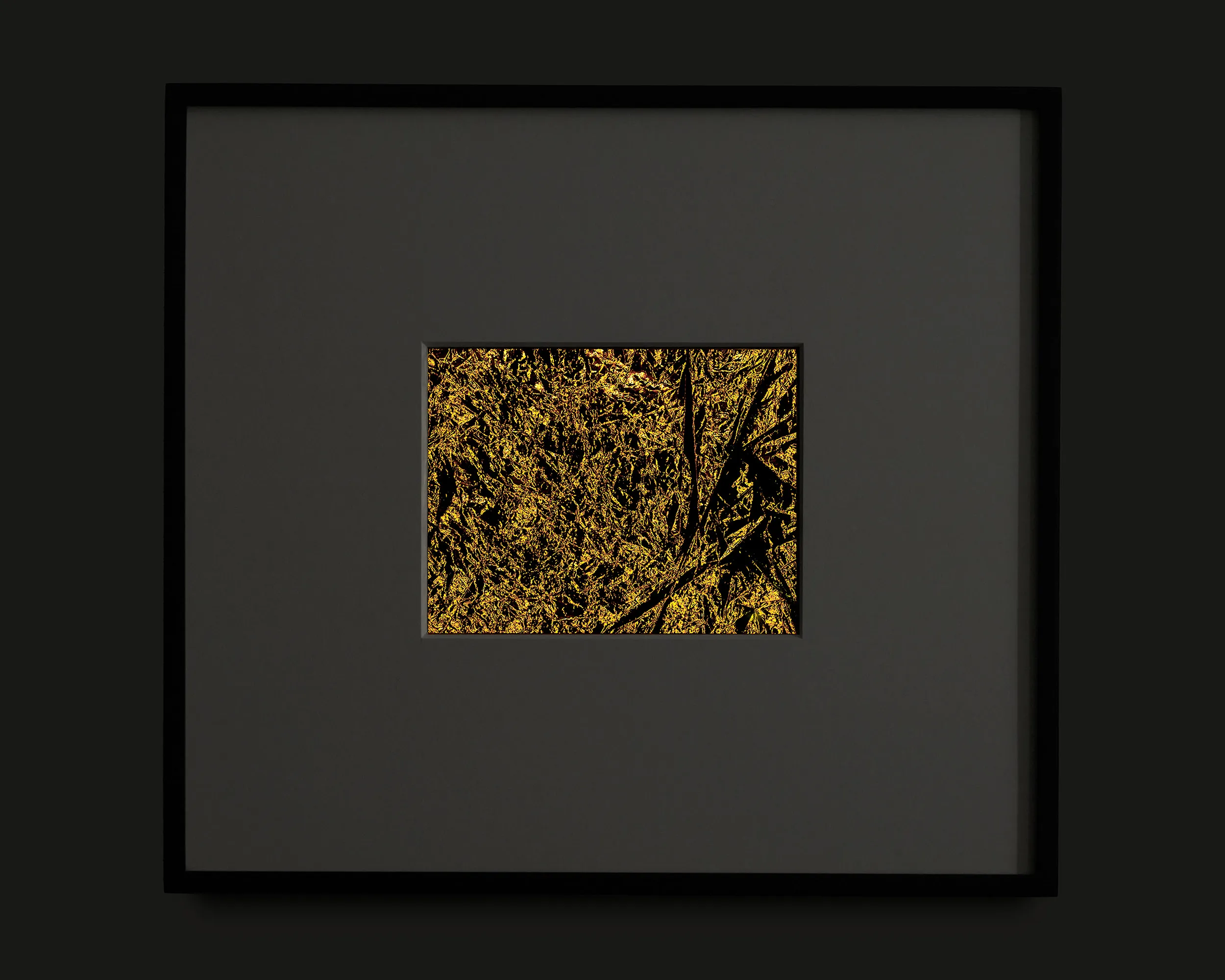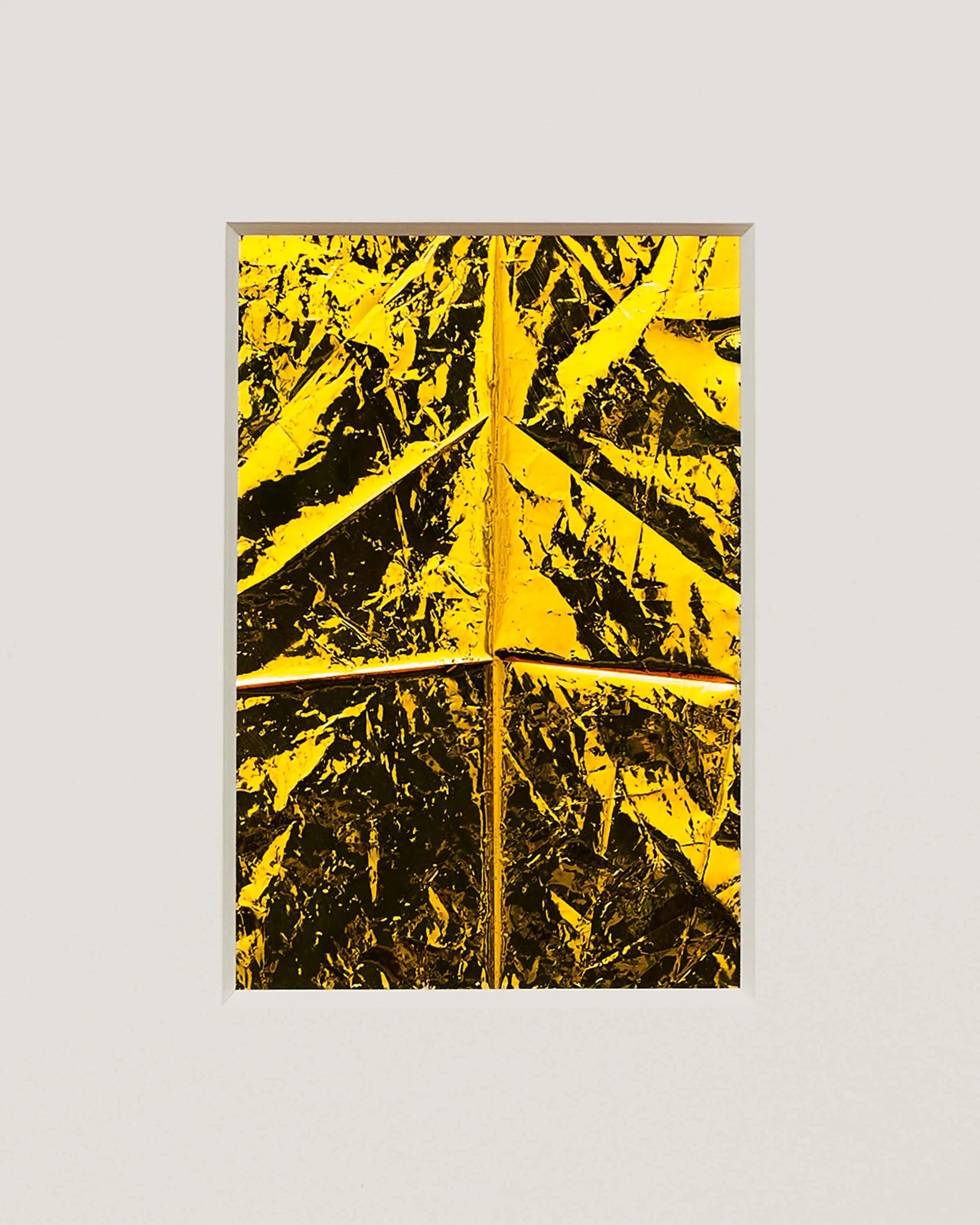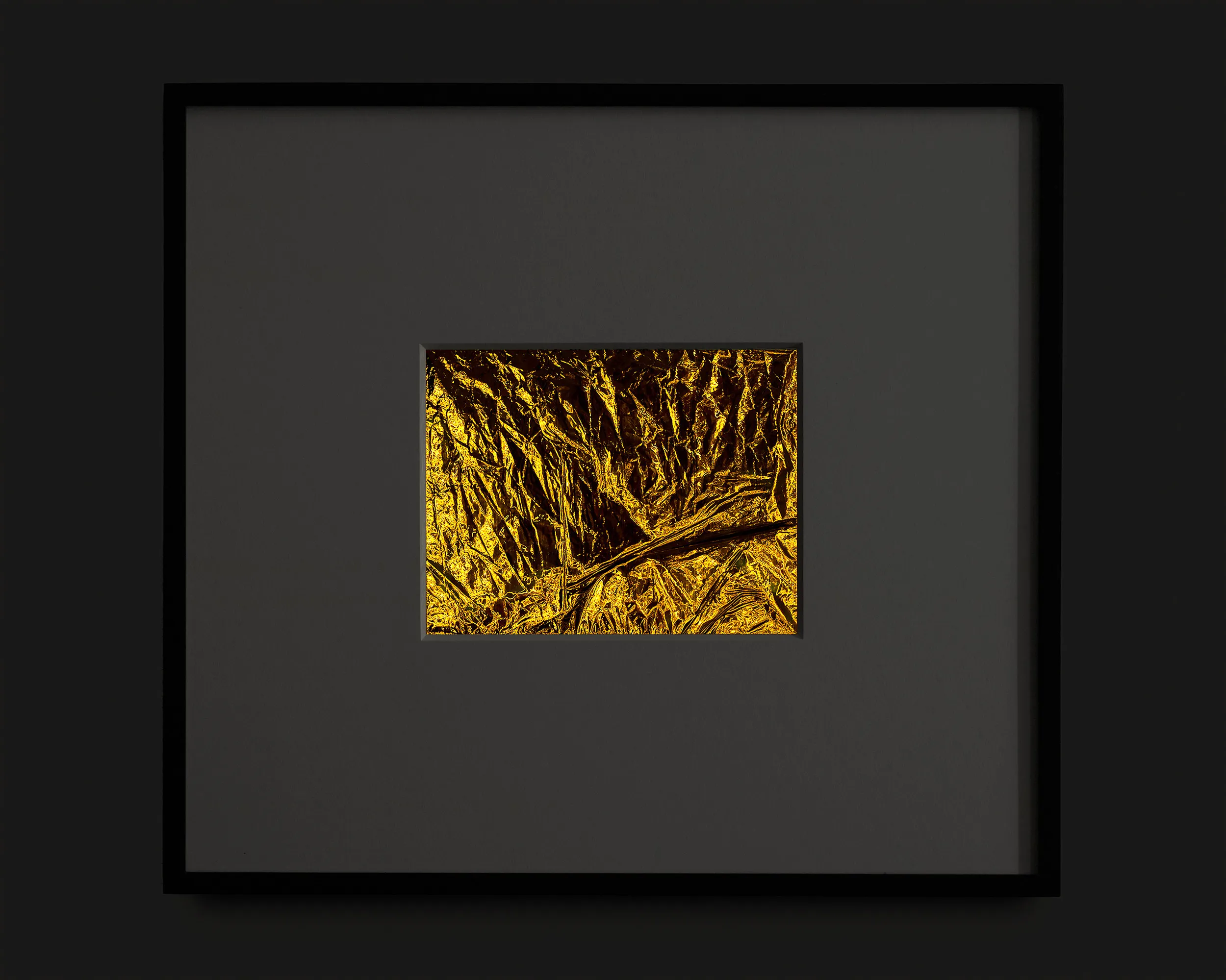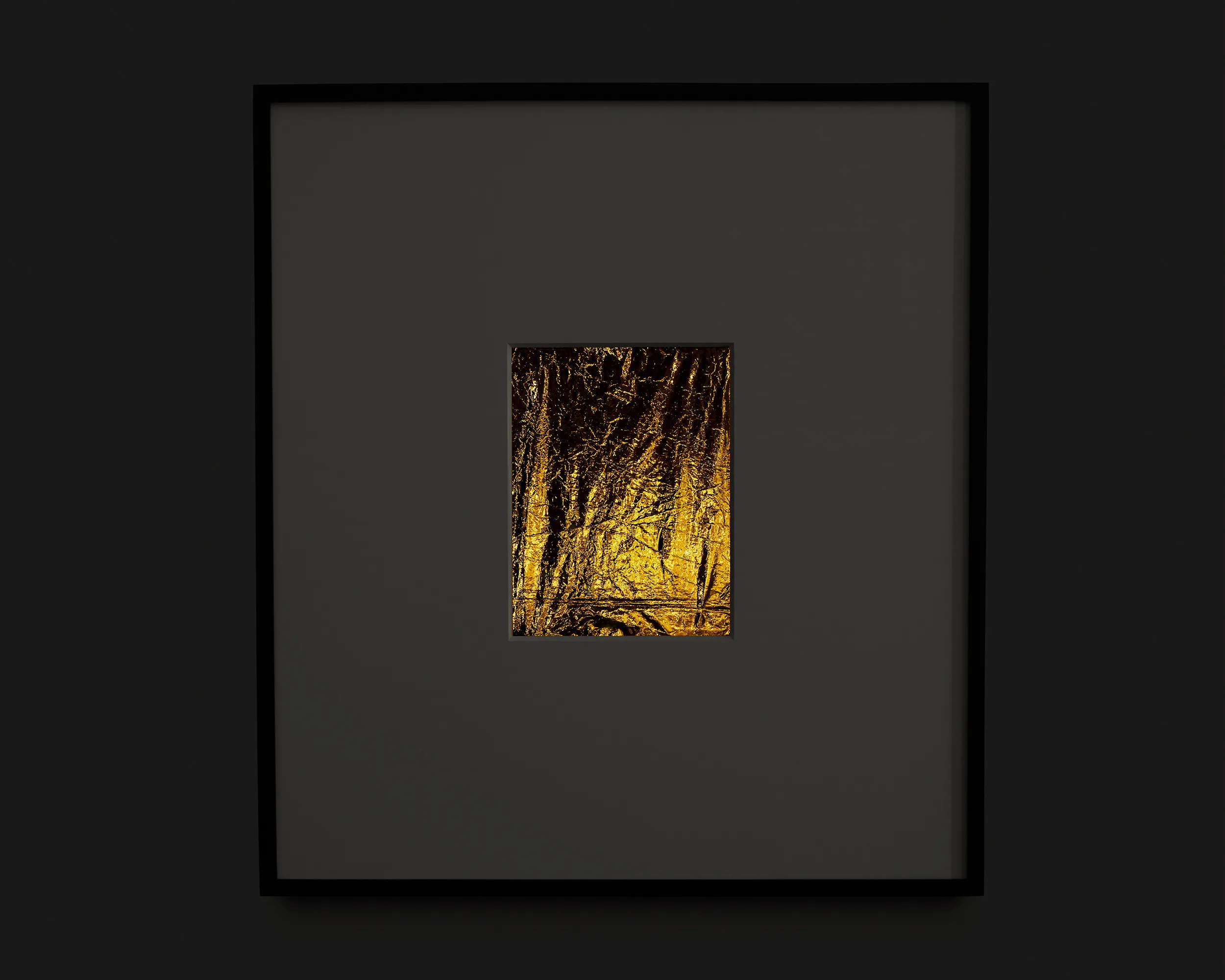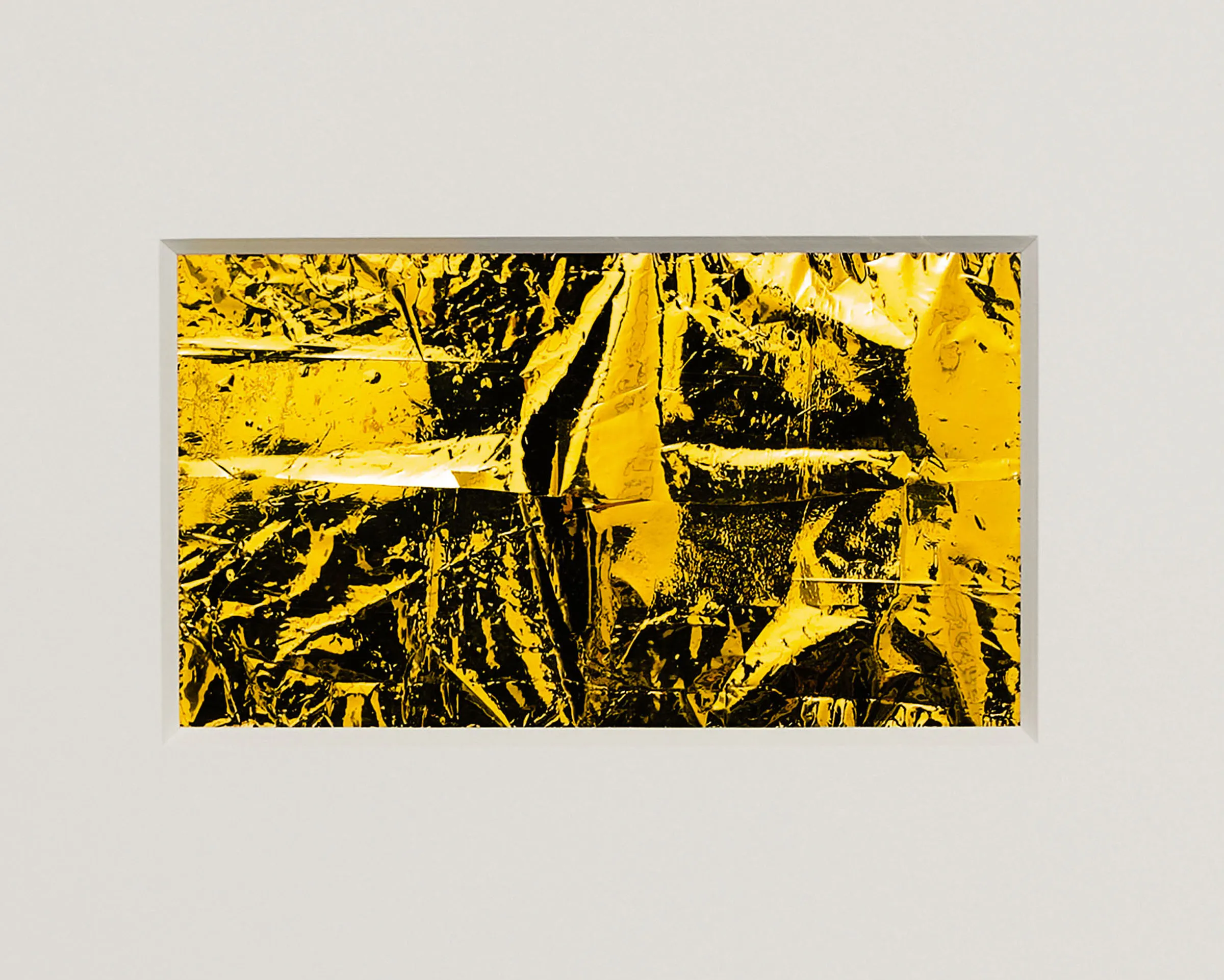 If Rembrandt domesticates Segers’ angel into a traditional landscape, the pieces in this exhibition may be said to make the opposite gesture: magnifying the material of unearthly flight. The density of markmaking used to depict the angel’s wings in Segers is mirrored by the wrinkled folds of the kapton. Werner Herzog called Segers’ prints “searchlights” into the “recesses of the self.” The kaptons chart a similar territory. There are rivulets, flashes of light, dark crevasses, summits and valleys, shattered surface. Patchworks of lineation filled with a kinetic, inter-planetary energy. Gold ground. “States of mind.” What Segers might call landscapes.